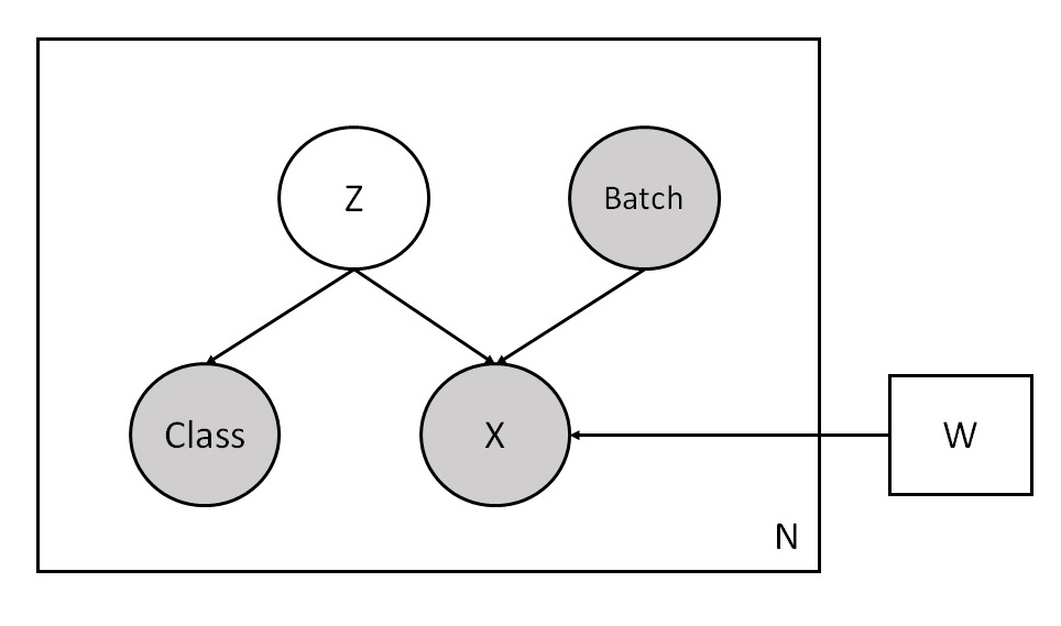 The following shows a graphical representation of our VAE model. It uses the unobserved latent variable Z and the observed batch labels Batch to reconstruct input data X and class labels Class. Note that the model treats Class as an independent variable from X given Z.
